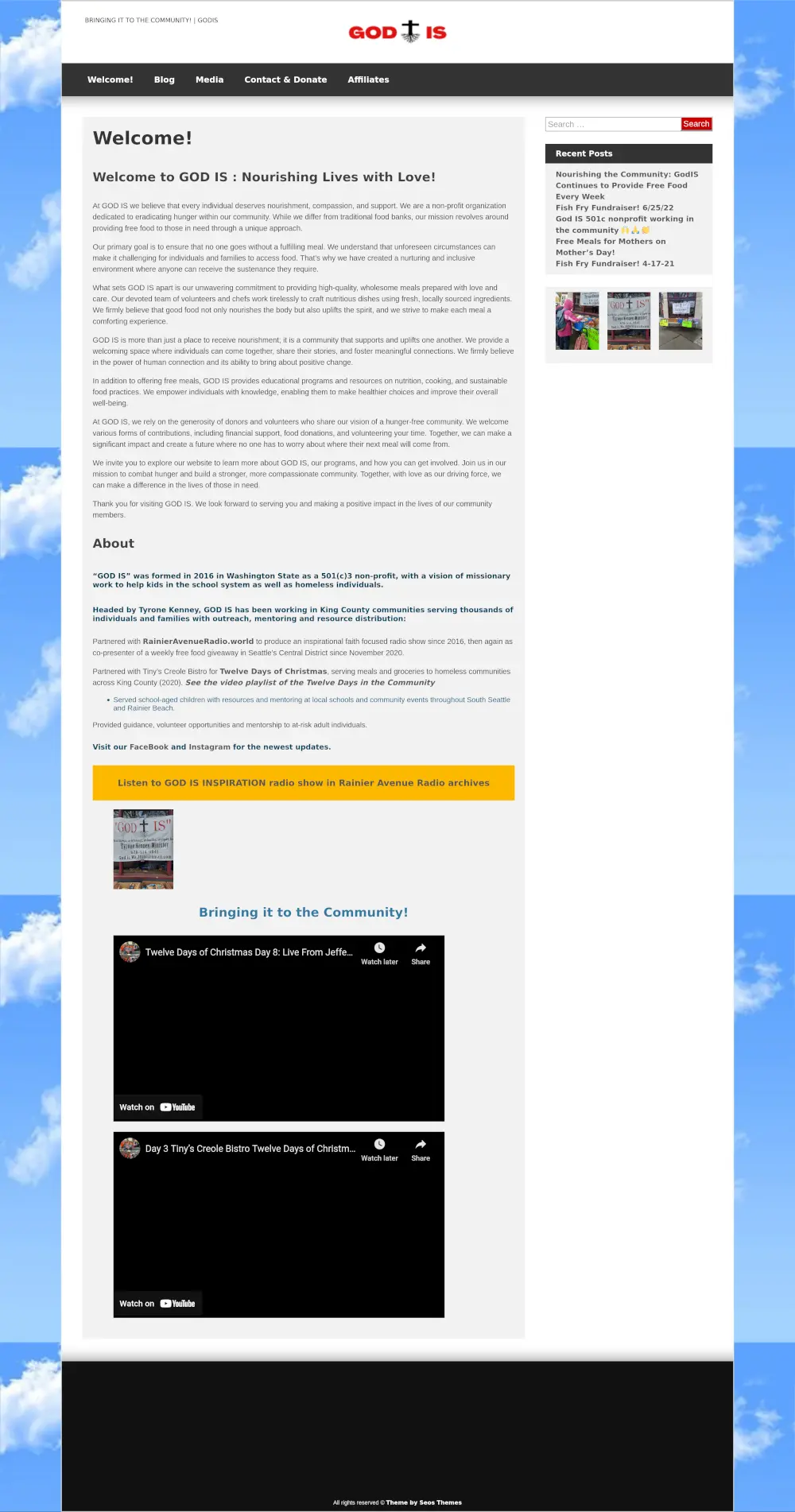 "GOD IS" is a non-profit business that provides the latest resources for homeless people. "GOD IS" gives out free food to the homeless and people in need. They also help the youth of the community find homes and give them placement in homes where they are safe.
